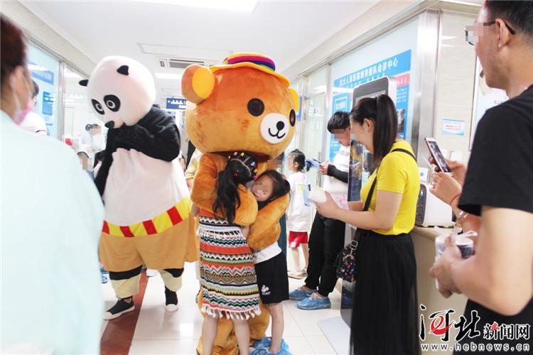 在候診大廳看到醫(yī)院工作人員裝扮的布朗熊和功夫熊貓,孩子們興奮不已,各個洋溢著歡樂的笑臉;顒右婚_始,“布朗熊”就用溫和的話語給小朋友們解釋自己身上的疾病,舒緩皮膚病患兒的自卑!斑@種病完全不會傳染給別人,小朋友們不要自卑,不要覺得這是自己的缺陷。每個人都會生病,很多小朋友的病情都可以得到有效控制,并且逐漸復色!