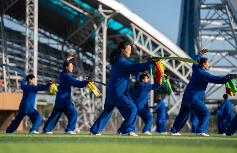 5月27日,市民在河北省黃驊市天健湖共享體育場(chǎng)練習(xí)太極拳。