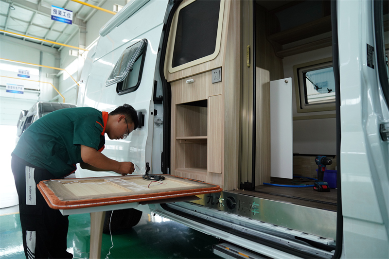 6月26日,在河北省黃驊市京津裝備制造轉(zhuǎn)移園一家專用車生產(chǎn)企業(yè)車間,工人在裝修房車內(nèi)飾。