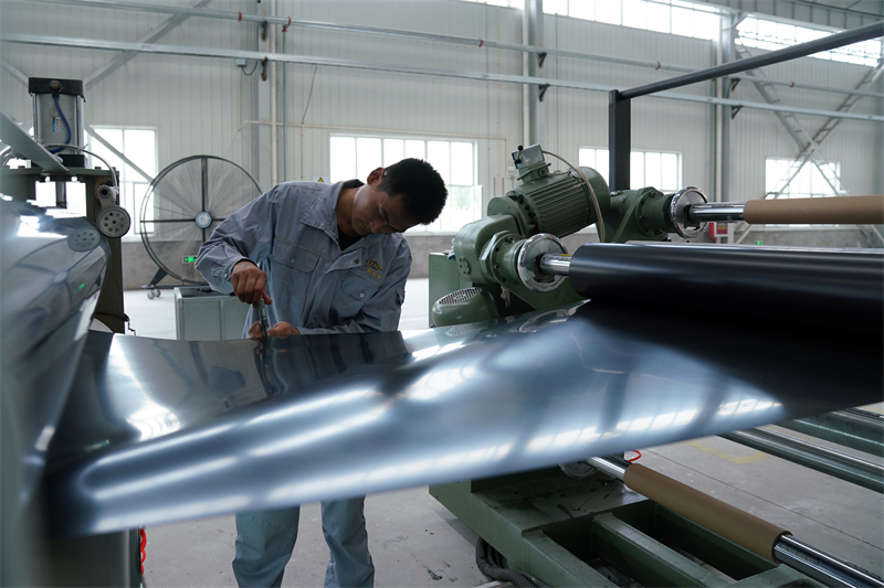 6月26日,在河北省黃驊市京津裝備制造轉(zhuǎn)移園一家冷卻塔填料制造企業(yè)車間,工人在檢查生產(chǎn)材料。新華社記者 駱學(xué)峰 攝