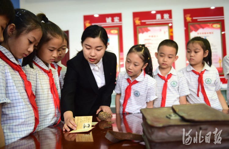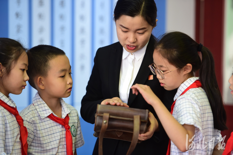 9月23日,滄州博物館工作人員向滄州市上海路小學(xué)的孩子講述紅色文物公文包的故事。
