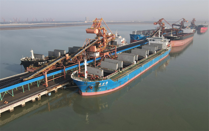 1月8日,船舶在黃驊港碼頭裝運煤炭(無人機(jī)照片)。新華社記者 王民 攝