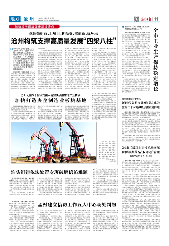 河北日報訊(記者王雅楠)黨的二十大報告提出,建設現(xiàn)代化產(chǎn)業(yè)體系。堅持把發(fā)展經(jīng)濟的著力點放在實體經(jīng)濟上,推進新型工業(yè)化,加快建設制造強國、質(zhì)量強國、航天強國、交通強國、網(wǎng)絡強國、數(shù)字中國。滄州市堅持以科技創(chuàng)新為引領,以抓招商、上項目、擴投資為支撐,促進創(chuàng)新鏈產(chǎn)業(yè)鏈深度融合,加快推動產(chǎn)業(yè)基礎高級化、產(chǎn)業(yè)鏈現(xiàn)代化,培育發(fā)展新動能新優(yōu)勢,推動構(gòu)建現(xiàn)代化產(chǎn)業(yè)體系取得新成效。