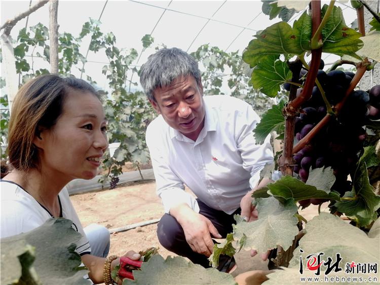 近日,嘎海溝村黨支部書記王海(右)到村民孫淑梅家了解葡萄種植和銷售情況。 記者陳寶云攝