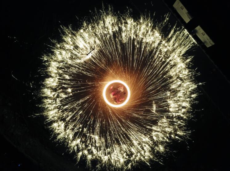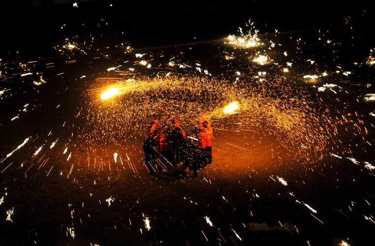 當日,河北省灤平縣火斗山鎮(zhèn)大店子村民間藝人在村文化廣場表演“掄花”。“掄花”是當?shù)匾豁梻鹘y(tǒng)民俗,被列入國家級非物質(zhì)文化遺產(chǎn)名錄。表演時,幾名民間藝人將木炭和碎鐵片一起放到掛在花架上的花筒中燃燒,再合力掄起花架,使花筒內(nèi)升溫,鐵花飛濺,形成耀眼的光環(huán)。 新華社發(fā)(王立群攝)