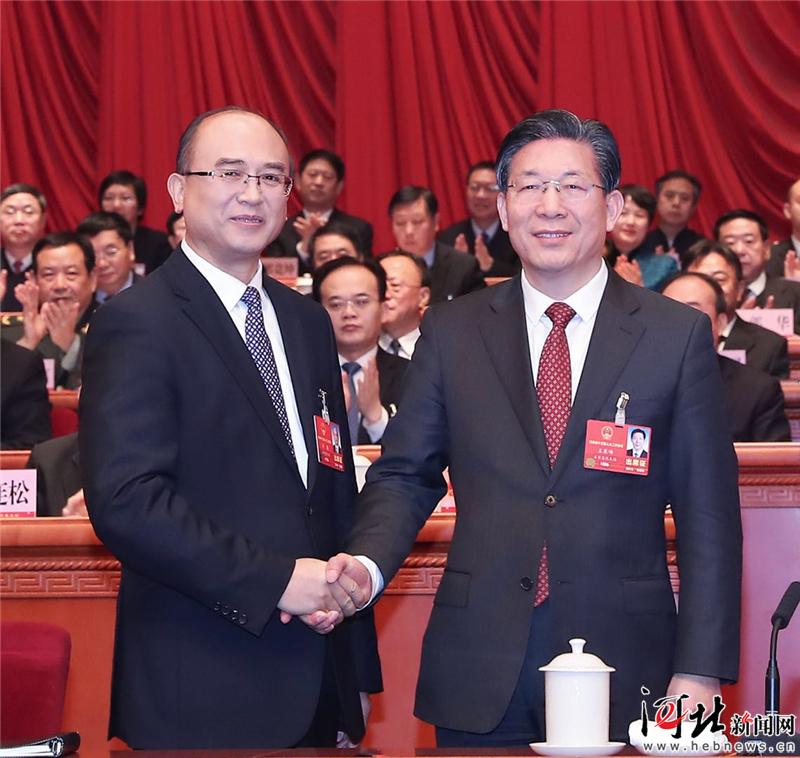 1月14日上午,河北省第十三屆人民代表大會第二次會議在省會河北會堂開幕。許勤作政府工作報告后,王東峰與許勤握手。 記者趙海江 田明攝