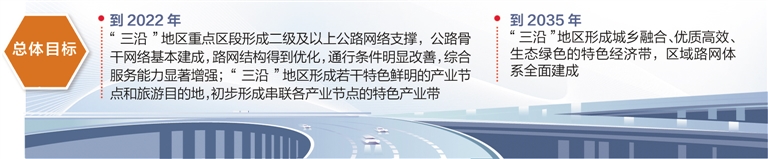 總體目標(biāo)是,到2022年,“三沿”地區(qū)重點(diǎn)區(qū)段形成二級(jí)及以上公路網(wǎng)絡(luò)支撐,公路骨干網(wǎng)絡(luò)基本建成,路網(wǎng)結(jié)構(gòu)得到優(yōu)化,通行條件明顯改善,綜合服務(wù)能力顯著增強(qiáng);“三沿”地區(qū)形成若干特色鮮明的產(chǎn)業(yè)節(jié)點(diǎn)和旅游目的地,初步形成串聯(lián)各產(chǎn)業(yè)節(jié)點(diǎn)的特色產(chǎn)業(yè)帶,交通、旅游、產(chǎn)業(yè)融合發(fā)展模式逐步推廣,綜合開發(fā)模式創(chuàng)新取得實(shí)質(zhì)進(jìn)展。到2035年,“三沿”地區(qū)形成城鄉(xiāng)融合、優(yōu)質(zhì)高效、生態(tài)綠色的特色經(jīng)濟(jì)帶,交通、生態(tài)、旅游、產(chǎn)業(yè)、城鎮(zhèn)全面融合,布局完善、銜接順暢、運(yùn)行高效、配套完備、安全舒適、生態(tài)環(huán)保的區(qū)域路網(wǎng)體系全面建成,有力支撐和全面融入“三沿”地區(qū)產(chǎn)業(yè)發(fā)展帶。