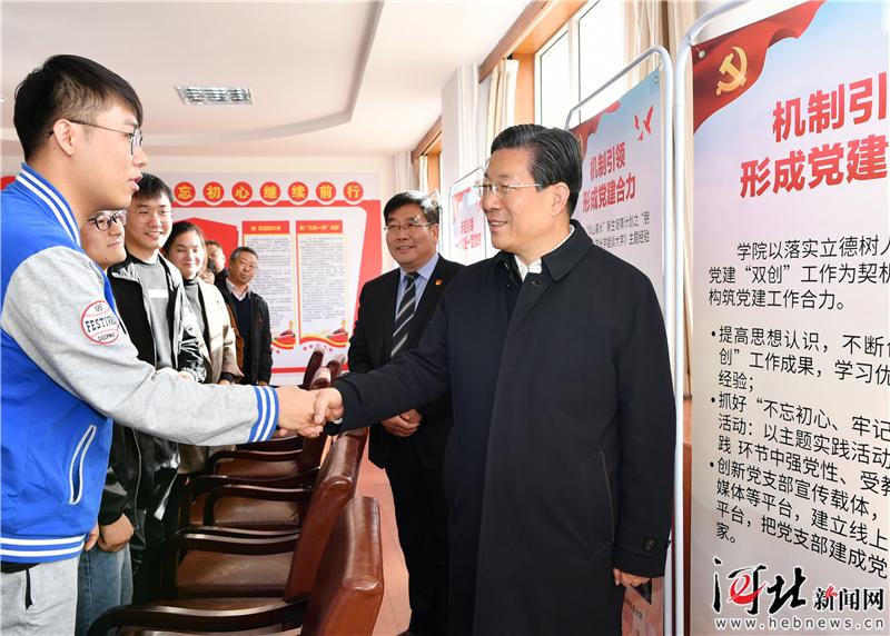 按照黨中央部署精神和省委安排,11月13日上午,省委書(shū)記、省人大常委會(huì)主任王東峰到河北政法職業(yè)學(xué)院、河北地質(zhì)大學(xué)、河北科技大學(xué)宣講黨的十九屆四中全會(huì)精神。這是王東峰在河北地質(zhì)大學(xué)與勘查技術(shù)與工程學(xué)院黨支部的師生親切握手。 記者趙威攝