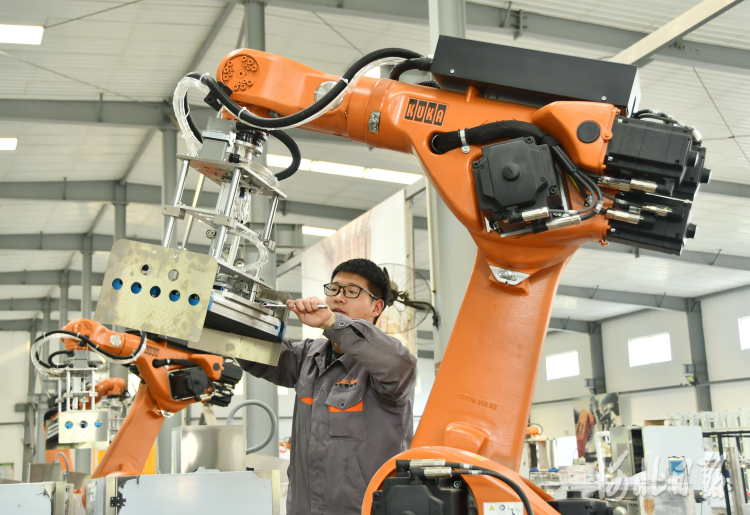 4月13日,在河北省邯鄲市永年工業(yè)園區(qū)的河北博柯萊智能裝備科技股份有限公司,工作人員正在安裝機器人抓手。