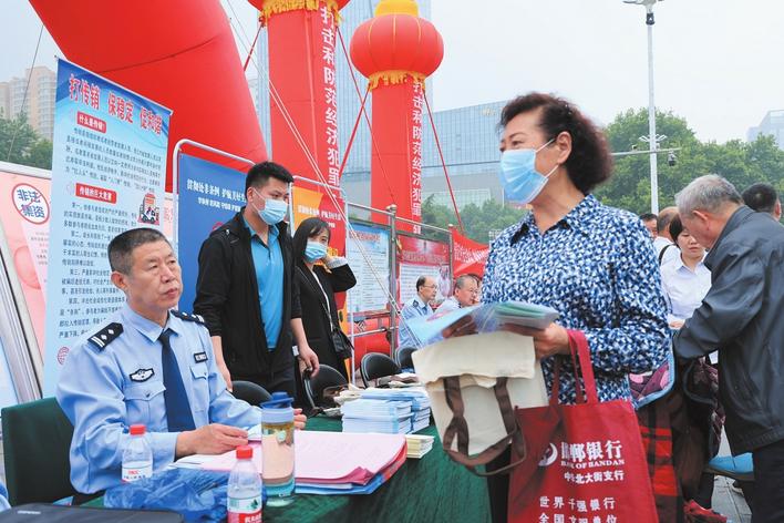 5月14日上午,在邯鄲市博物館廣場舉行的“5·15”經(jīng)偵宣傳日活動現(xiàn)場,公安干警向群眾宣傳防范非法集資相關(guān)知識。邯報融媒體記者張婉月攝