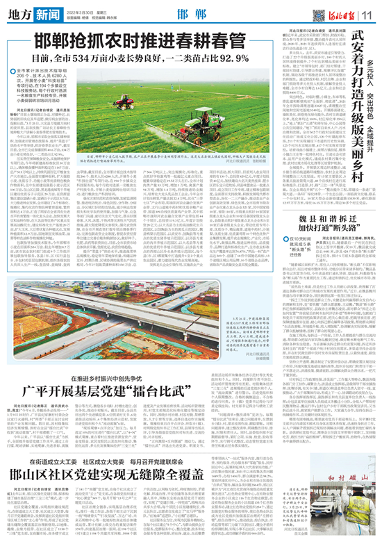 今年以來,邯鄲市采取全面落實(shí)播種面積、加強(qiáng)麥田管理農(nóng)技服務(wù)、提升“菜籃子”供給水平等舉措,抓好春季農(nóng)業(yè)生產(chǎn)。截至目前,全市已完成春播面積40.6萬畝,534萬畝小麥長勢良好,一二類苗占比92.9%。
