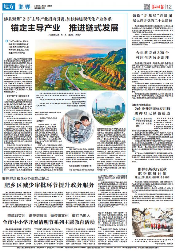 近年來,涉縣聚焦“2+3”主導(dǎo)產(chǎn)業(yè),狠抓招商引資,2022年該縣在重點(diǎn)項(xiàng)目考核中位列縣域排名全省第一!拔覀儓(jiān)持項(xiàng)目為王,以鏈?zhǔn)骄奂⑼晟茩C(jī)制、優(yōu)化服務(wù)為抓手,積蓄發(fā)展新動(dòng)能,推動(dòng)經(jīng)濟(jì)高質(zhì)量發(fā)展!鄙婵h縣委書記董路明介紹,今年已爭(zhēng)列省重點(diǎn)項(xiàng)目7個(gè)、市重點(diǎn)項(xiàng)目24個(gè),項(xiàng)目數(shù)量位居全市第一。