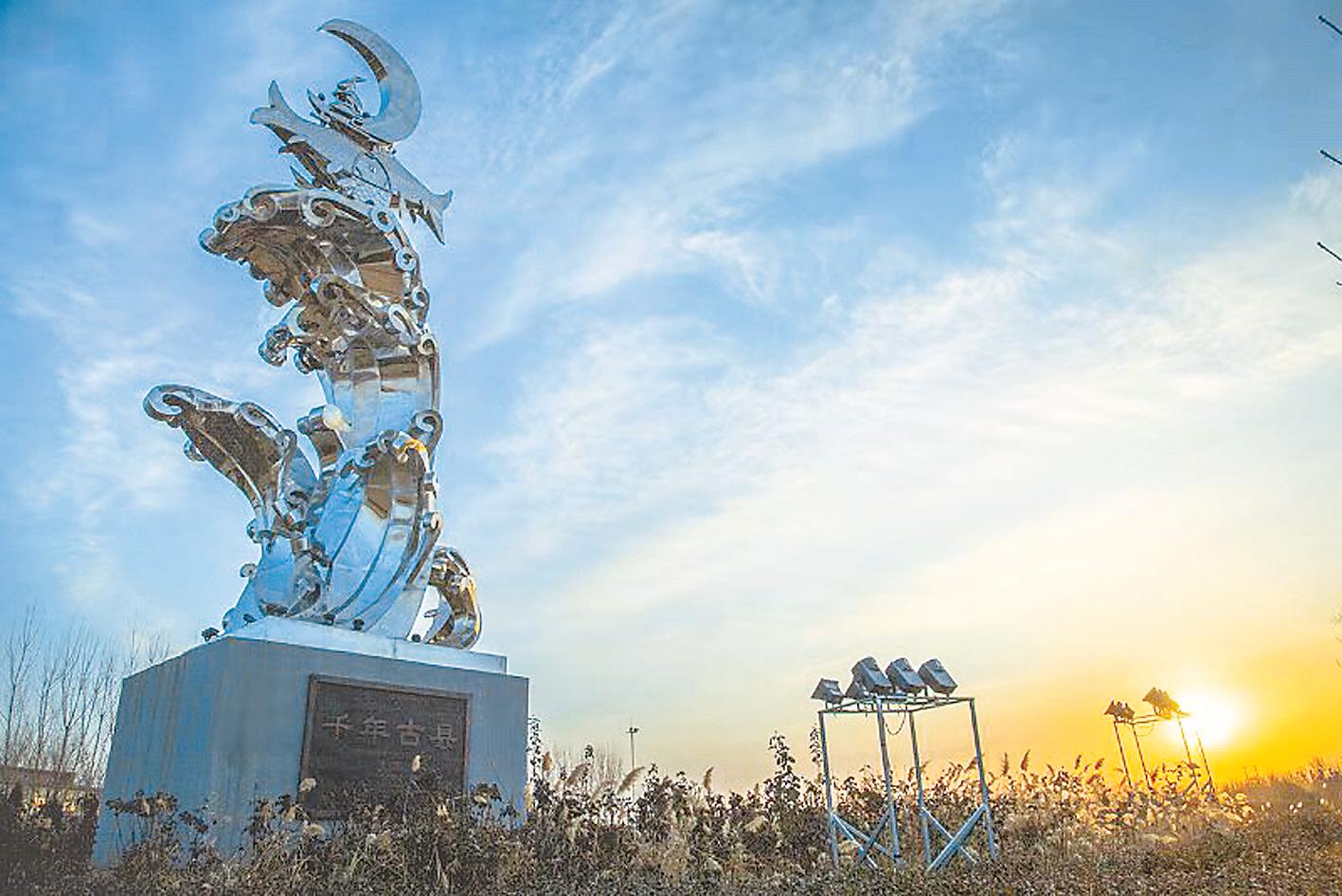 近年來,按照黨和國家“讓文物活起來”的指導精神,武強縣以武強年畫為依托,積極研發(fā)文化創(chuàng)意產(chǎn)品,全方位展現(xiàn)“千年古縣、文盛武強”的文化魅力。圖為畫鄉(xiāng)公園新竣工的“三魚爭月”雕塑。該作品來源于古老的武強年畫《三魚爭月》,與武強年畫代表作《六子爭頭》系同一思維方式,并使用民間年畫中慣用的諧音手法,意為“三魚爭躍”,以升騰景象,顯示了身在燕趙腹地的畫鄉(xiāng)人獨特的智巧與幽默,鼓舞人們奮力追夢,爭取美好幸福的生活。王清芝攝