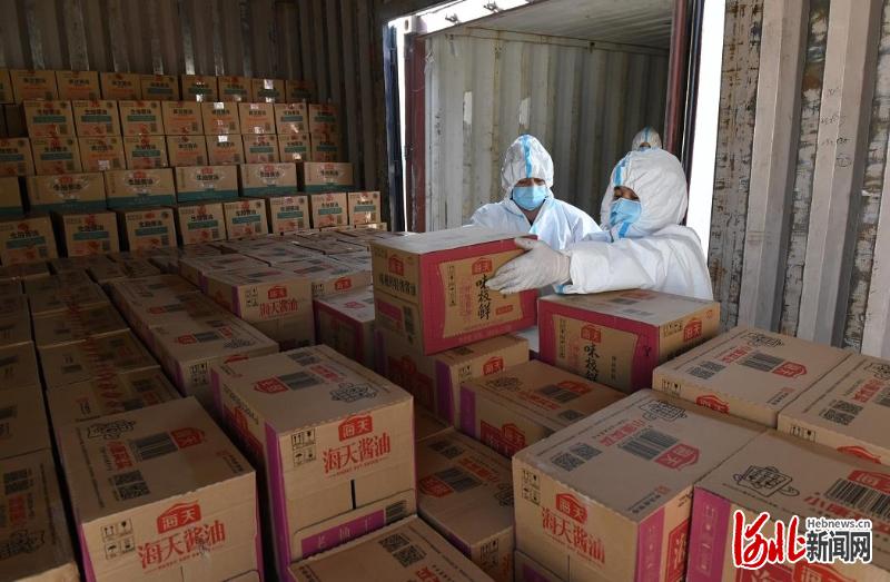 1月23日,在深州安華國際物流園,工作人員在搬運(yùn)中轉(zhuǎn)調(diào)運(yùn)的應(yīng)急物資。河北日報(bào)通訊員高占峰 攝