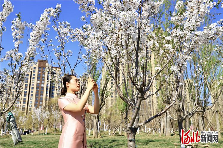 4月3日,游客在大廠(chǎng)回族自治縣櫻花公園拍照留念。 通訊員董旭旭攝