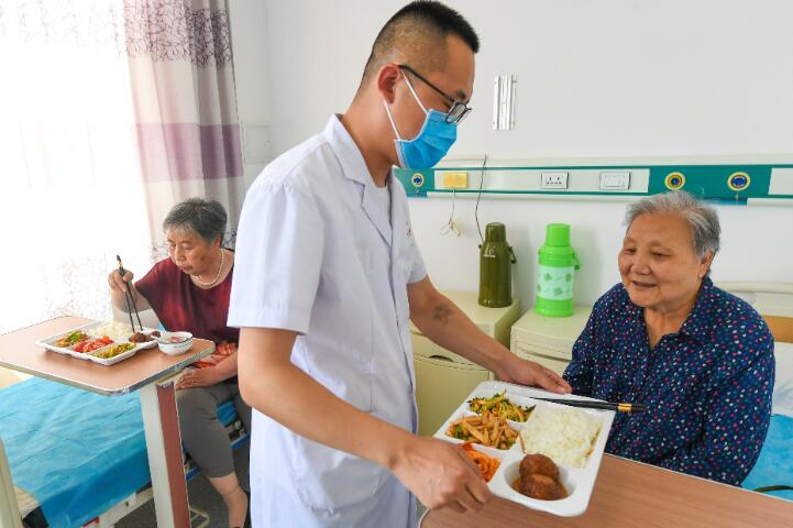 6月12日,在河北省廊坊市廣陽區(qū)逸錦家苑社區(qū)居家養(yǎng)老服務(wù)中心,醫(yī)護(hù)人員為老人送上飯菜。