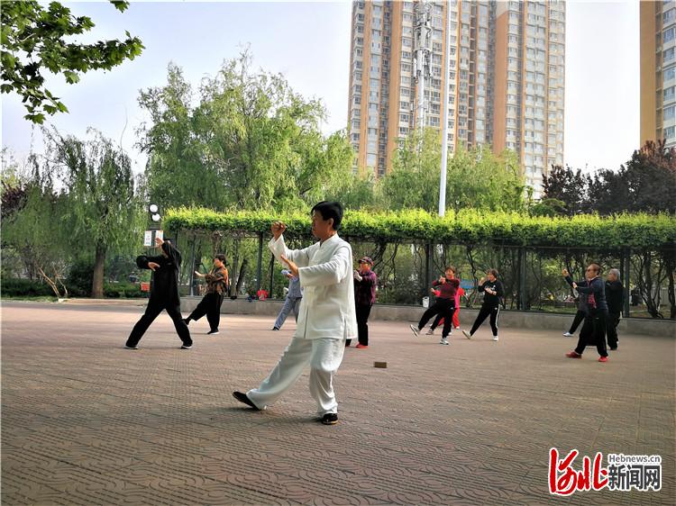 五一公園內,晨練的群眾正在打太極拳。