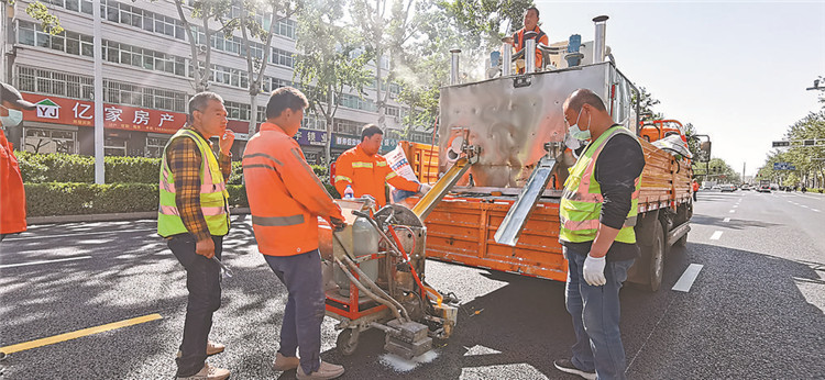 工人們正在進行交通標(biāo)線施工。記者呂新穎攝