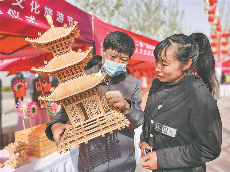 秸稈扎刻制作技藝傳承人徐健為武清市民介紹秸稈扎刻技藝。記者張?zhí)┰磾z