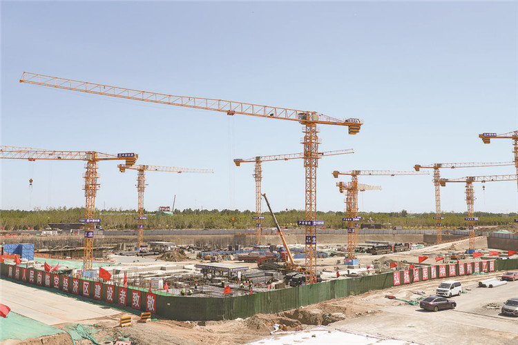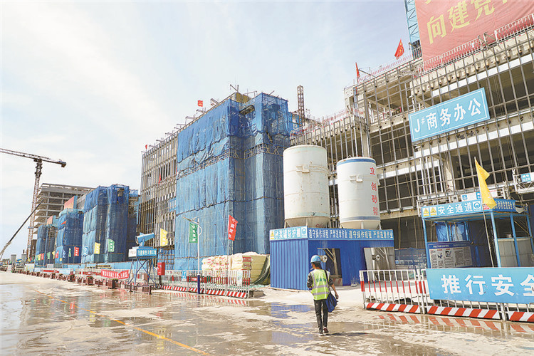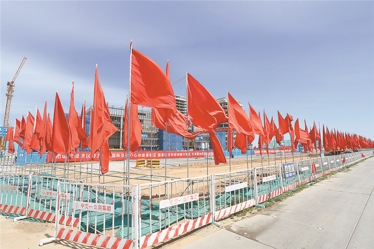 臨空服務中心項目建設現(xiàn)場紅旗飄飄。