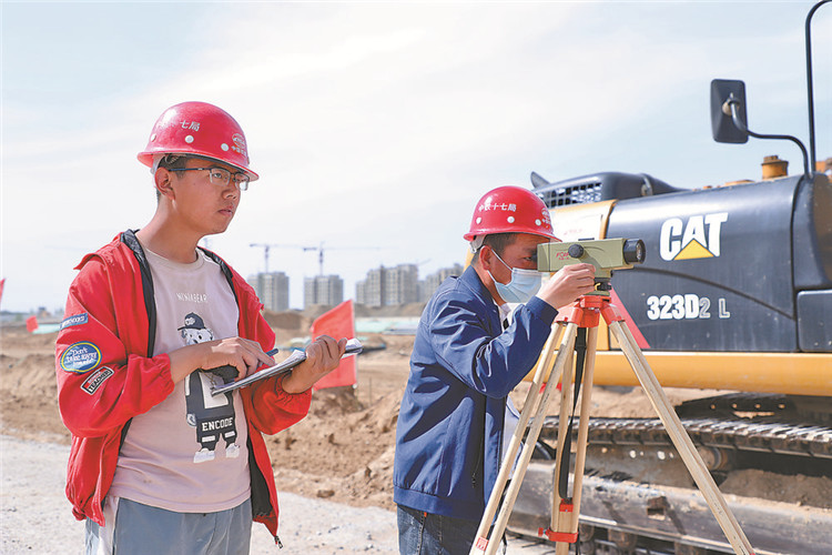 北京大興國際機場綜合保稅區(qū)(河北)一期及相關配套項目的技術人員正在測量路床高程。