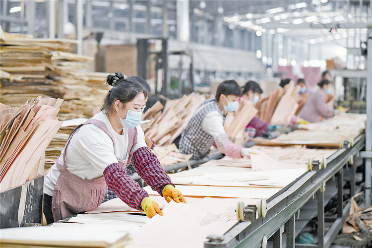 圖為文安縣春立木業(yè)有限公司工人正在清水板生產線上忙碌。