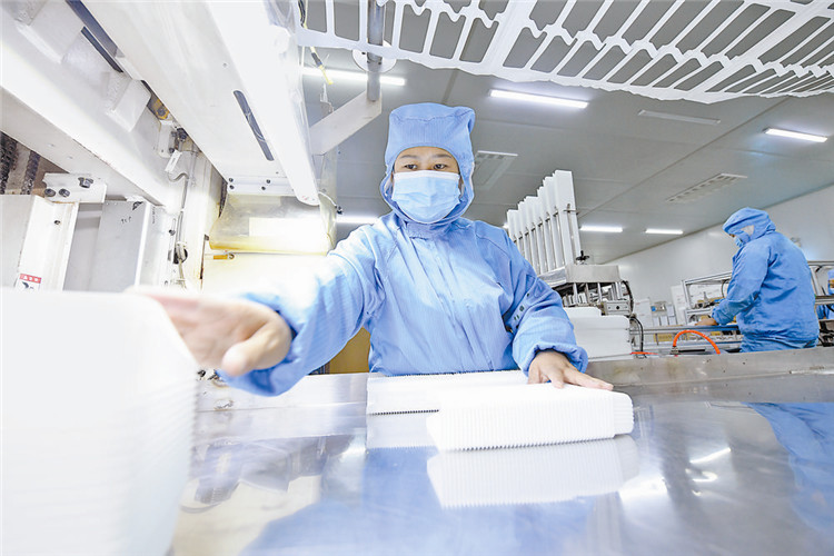 圖為在文安縣經濟開發(fā)區(qū)河北鯤運塑料包裝科技有限公司生產車間內,工人正在整理冰淇淋包裝。