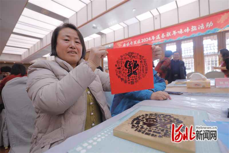 妙筆生花送溫暖,翰墨留香迎新春;顒蝇F(xiàn)場,廊坊市硬筆書法協(xié)會的5位書法老師揮毫潑墨,將新春的誠摯祝福訴諸筆端。一個個飽含神韻的“!弊郑桓备痹⒁饧榈拇郝(lián),在書法家們的筆下“新鮮出爐”。拓福迎春環(huán)節(jié)將傳統(tǒng)習(xí)俗“貼福字”和傳統(tǒng)工藝“拓印”相結(jié)合,讓群眾在活動中體驗(yàn)雕版拓印的樂趣,感受傳統(tǒng)民俗的年味。在老師的指導(dǎo)下,大家還紛紛投入到剪紙的學(xué)習(xí)和創(chuàng)作中,剪出濃濃的生活情趣。