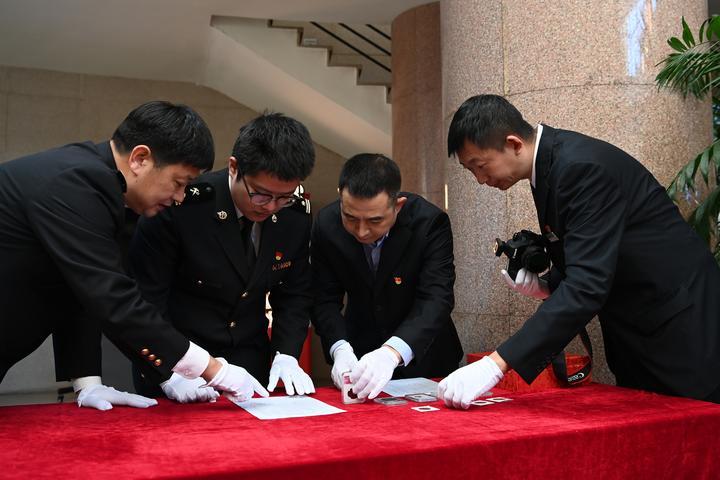 2024年3月1日,廊坊海關(guān)工作人員核對罰沒的9枚古錢幣。新華社記者王民攝