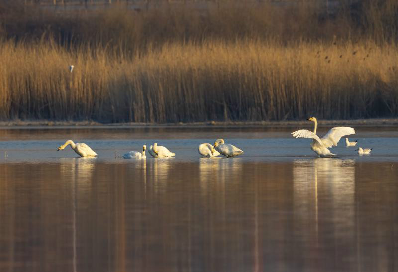 大天鵝在河北秦皇島山海關(guān)大石河內(nèi)游弋。謝慶和攝