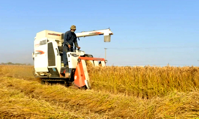 在陳繼東身后,燦爛秋光下,遍地金黃,沃野如畫,沉甸甸的稻穗將稻稈壓彎了腰,今年試驗(yàn)田原有品種再次高產(chǎn)豐收。割稻、脫粒、裝車…………試驗(yàn)田內(nèi)全程機(jī)械化作業(yè)一氣呵成,大粒飽滿的稻粒盡收囊中,開鐮時(shí)節(jié),田間地頭一派豐收的喜人景象。