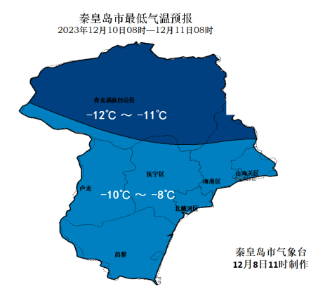 12月8日15時21分,秦皇島市氣象臺發(fā)布寒潮藍色預警:受強冷空氣影響,預計8日夜間到10日,秦皇島市各縣區(qū)平均氣溫將持續(xù)下降8℃至10℃,11日早晨最低氣溫北部山區(qū)-11℃至-10℃,其他地區(qū)-9℃至-7℃,請防范。