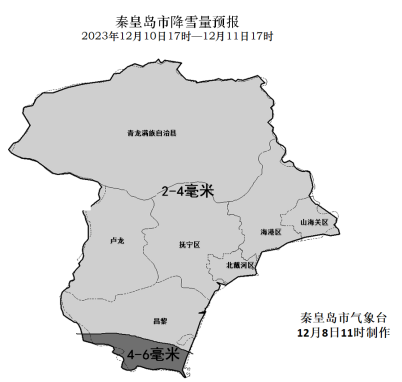 10日傍晚至11日白天,秦皇島市大部分地區(qū)有小到中雪(2至4毫米),積雪深度1至3厘米,昌黎南部有中到大雪(4至6毫米),積雪深度3至5厘米。