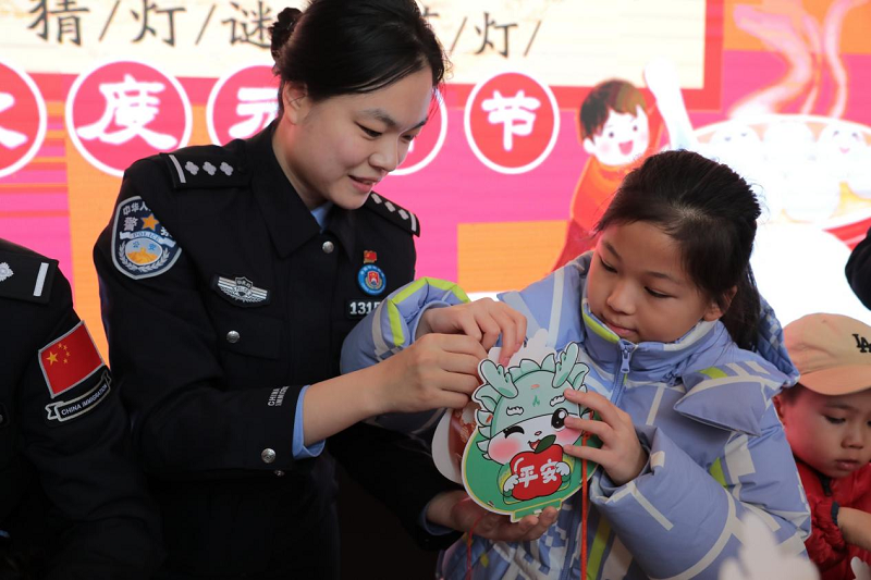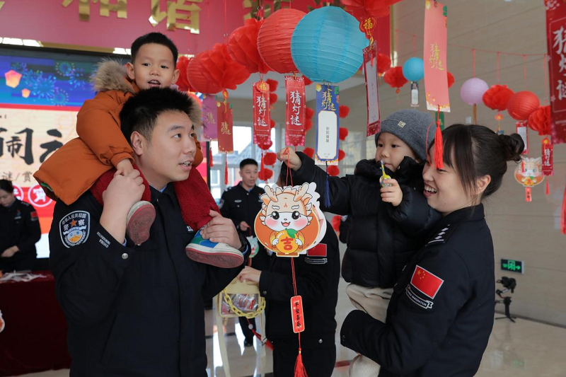 五彩繽紛的燈籠和謎題卡片懸掛在半空中,營(yíng)造了濃郁的節(jié)日氛圍。謎題集知識(shí)性和娛樂(lè)性于一體,涵蓋了傳統(tǒng)文化、成語(yǔ)故事、生活常識(shí)等多種類別。在猜燈謎環(huán)節(jié),民警和警娃們冥思苦想、樂(lè)在其中,時(shí)而口中念念有詞,時(shí)而相互熱烈討論謎底,現(xiàn)場(chǎng)氛圍熱火朝天。“做花燈、猜燈謎、兌禮物,我和孩子感受到了來(lái)自大家庭的溫暖,非常開心,新的一年我將堅(jiān)守崗位,當(dāng)好國(guó)門安全忠誠(chéng)守護(hù)者!眳⒓踊顒(dòng)的民警表示。