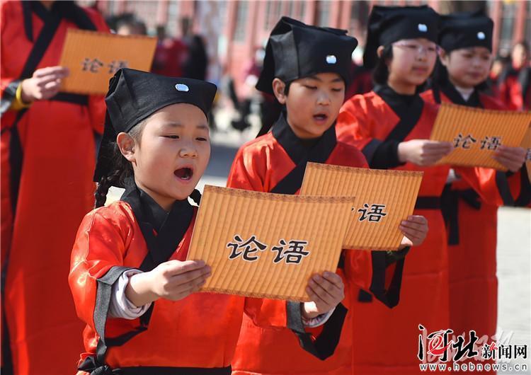 3月11日,小學(xué)生在正定文廟己亥春期釋奠禮上誦讀《論語》。 記者趙永輝攝影報(bào)道