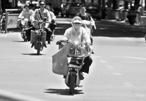 烈日暴曬下,市民“全副武裝”遮陽。記者郄磊攝