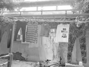 自來(lái)水公司宿舍內(nèi)的健身器材上晾著許多衣服。