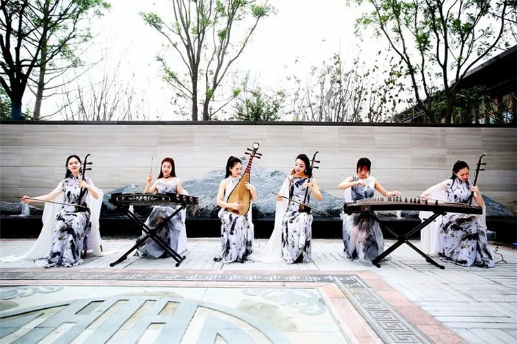 園區(qū)門(mén)口處進(jìn)行古風(fēng)樂(lè)坊的迎賓演奏