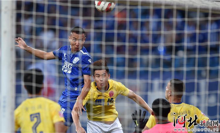 6月22日,石家莊永昌6號楊云(左二)頭球攻門瞬間。記者耿輝攝