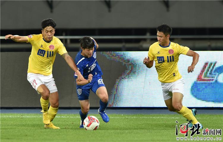 6月22日,石家莊永昌28號詹敏偉(右一)在比賽中帶球突破。記者耿輝攝