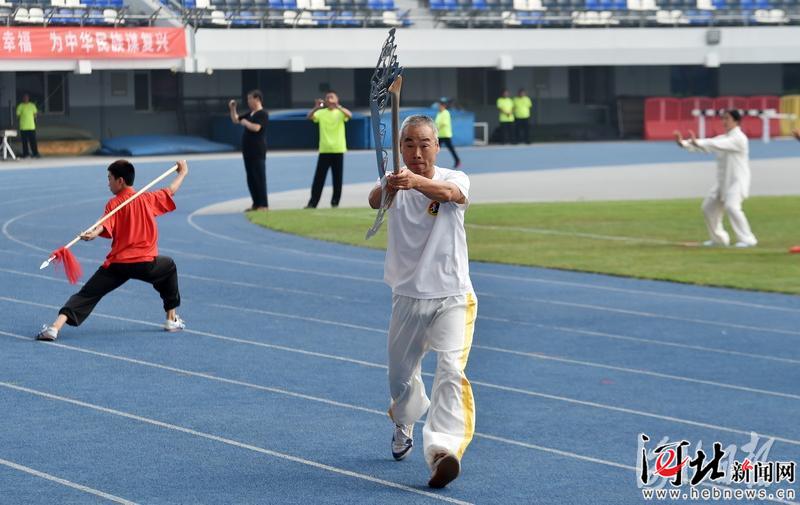 8月3日,石家莊市武術(shù)協(xié)會成員在進(jìn)行民間武術(shù)器械表演。