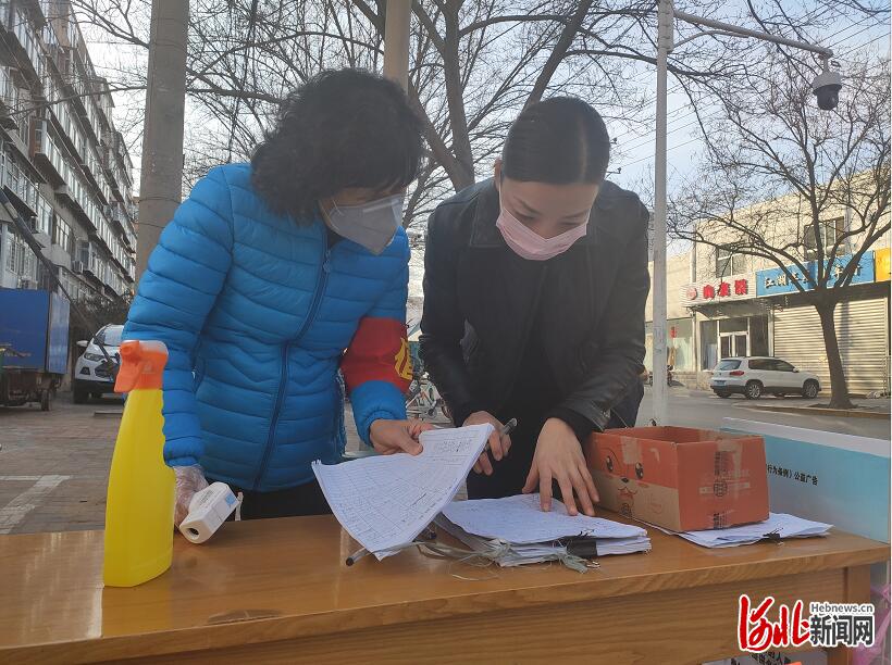 張曉(右)在變電街社區(qū)北苑小區(qū)門口防控點(diǎn)查看登記情況。