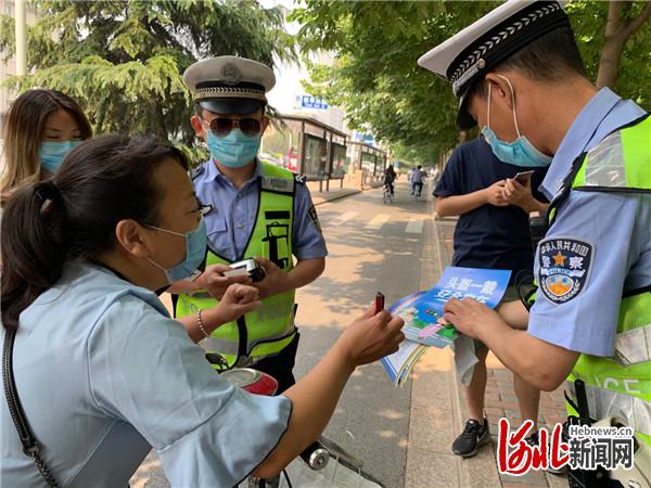 5月21日,河北石家莊裕華交警大隊(duì)在裕華路與富強(qiáng)大街交口進(jìn)行電動(dòng)自行車佩戴安全頭盔查糾宣傳活動(dòng)。圖為查究宣傳現(xiàn)場(chǎng)。