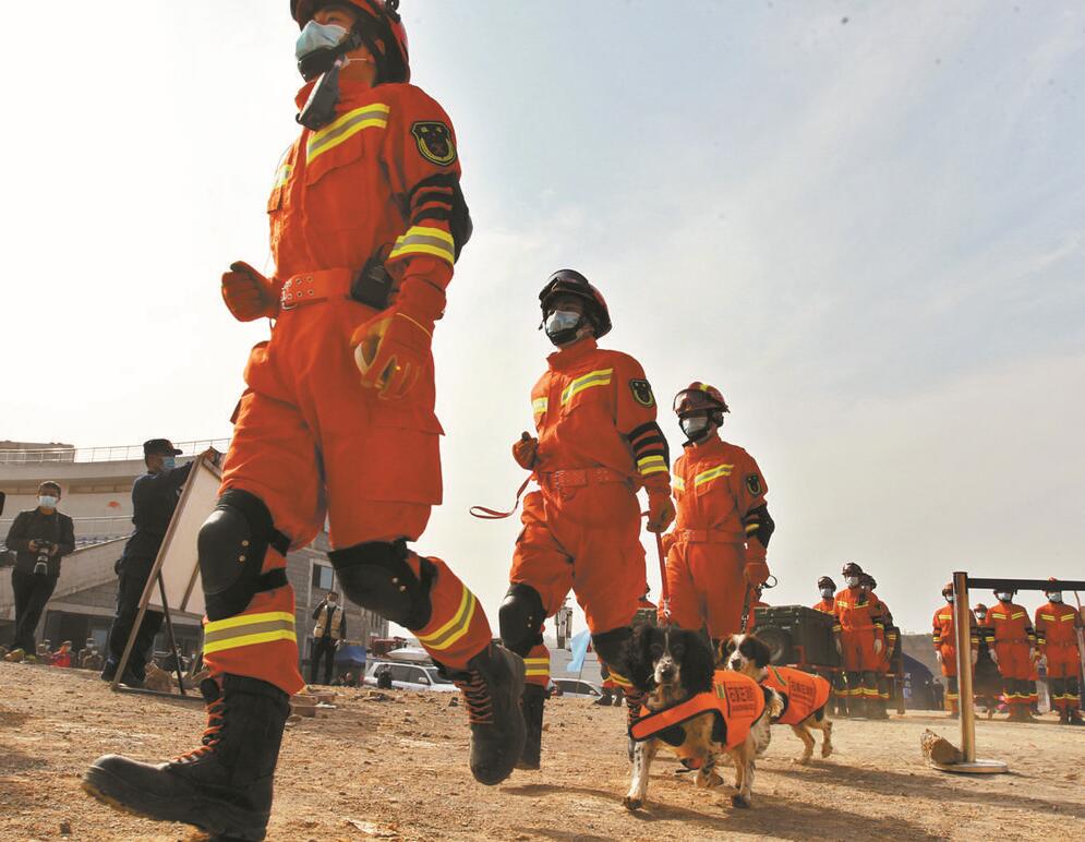 消防員帶領(lǐng)搜救犬趕到事發(fā)現(xiàn)場。記者張海強(qiáng)攝