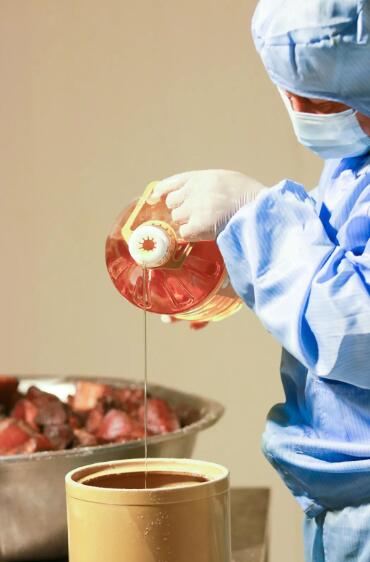 第八步:油封。將裹好鹽的肉放入消毒滅菌的罐內(nèi)用花生油油封,再用膠帶密封。