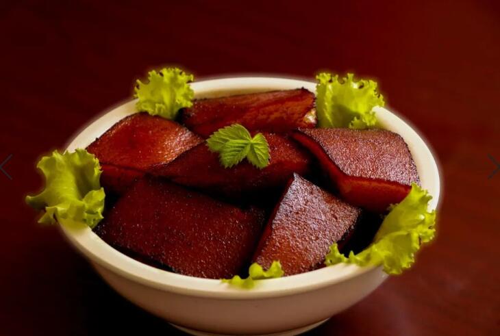 第五步:煮肉。把肉放入清水鍋中煮至五分熟祛除豬肉中的殘留物質(zhì),再放入調(diào)好配料的老湯鍋中煮至八分熟,撈出。