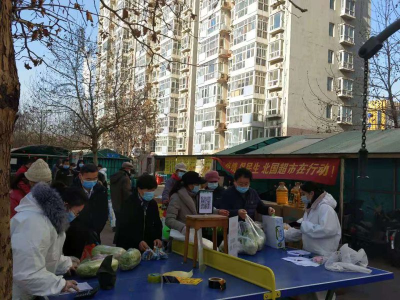 圖為躍進(jìn)街道和華社區(qū)依水苑小區(qū),北國(guó)超市正在售賣果蔬,居民有序買菜、保持距離。