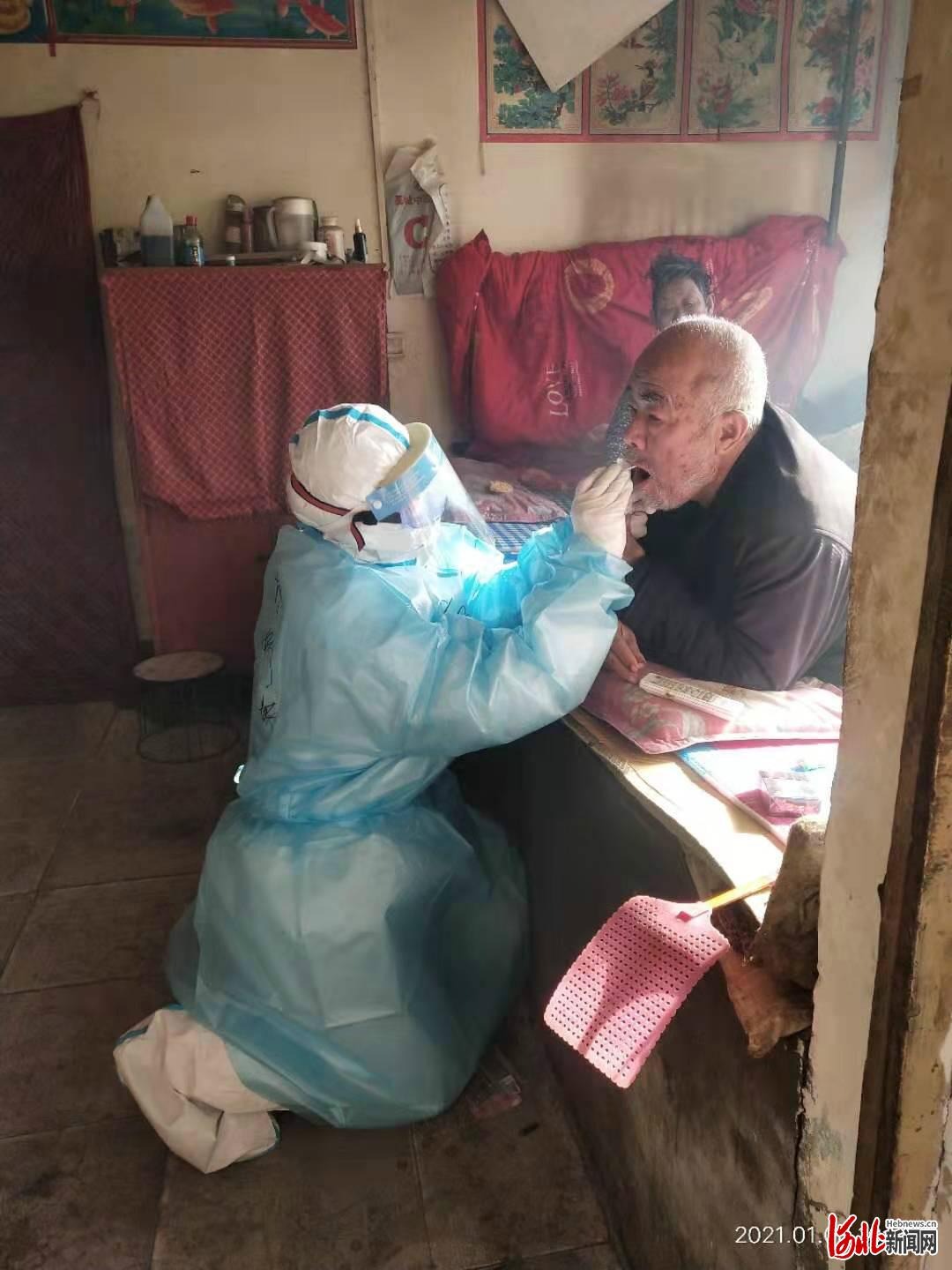 1月8日,隊(duì)員郭嬌嬌為一名臥床的老人采集核酸,因?yàn)樗纳砀吲c老人臥位的差異,為了更加清楚的暴露采集部位,保證標(biāo)本采集質(zhì)量,她跪在地上,用手托住老人家的下頜,為老人采集核酸,此時(shí)沒有高低貴賤,沒有貧富差異,有的只是使命,是對(duì)生命的敬畏。