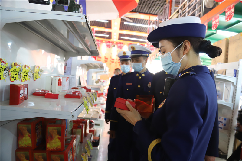 "3·15"消防產(chǎn)品專(zhuān)項(xiàng)檢查行動(dòng)現(xiàn)場(chǎng)。 裕華區(qū)消防救援大隊(duì)供圖