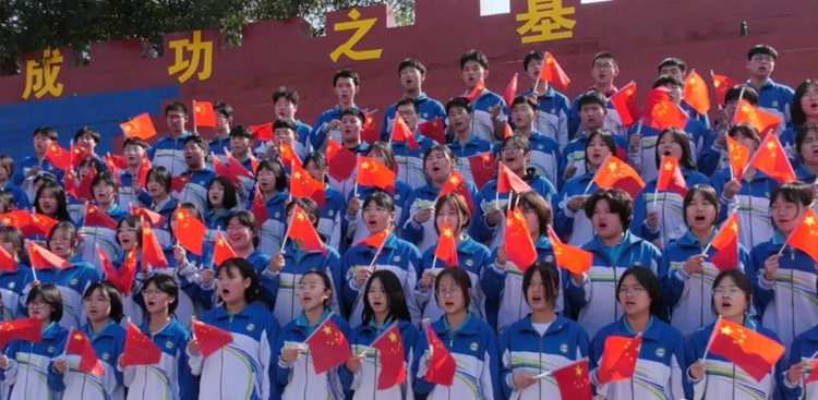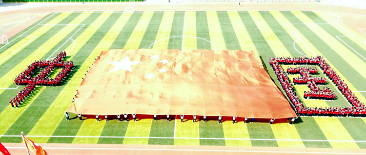綠色的操場上閃動(dòng)著學(xué)生們的身影,30x40米的巨幅五星紅旗在學(xué)生們的擺動(dòng)下,越發(fā)鮮艷;高一的學(xué)生們共同合作,擺成“中國”二字,表達(dá)對祖國最誠摯的祝福。